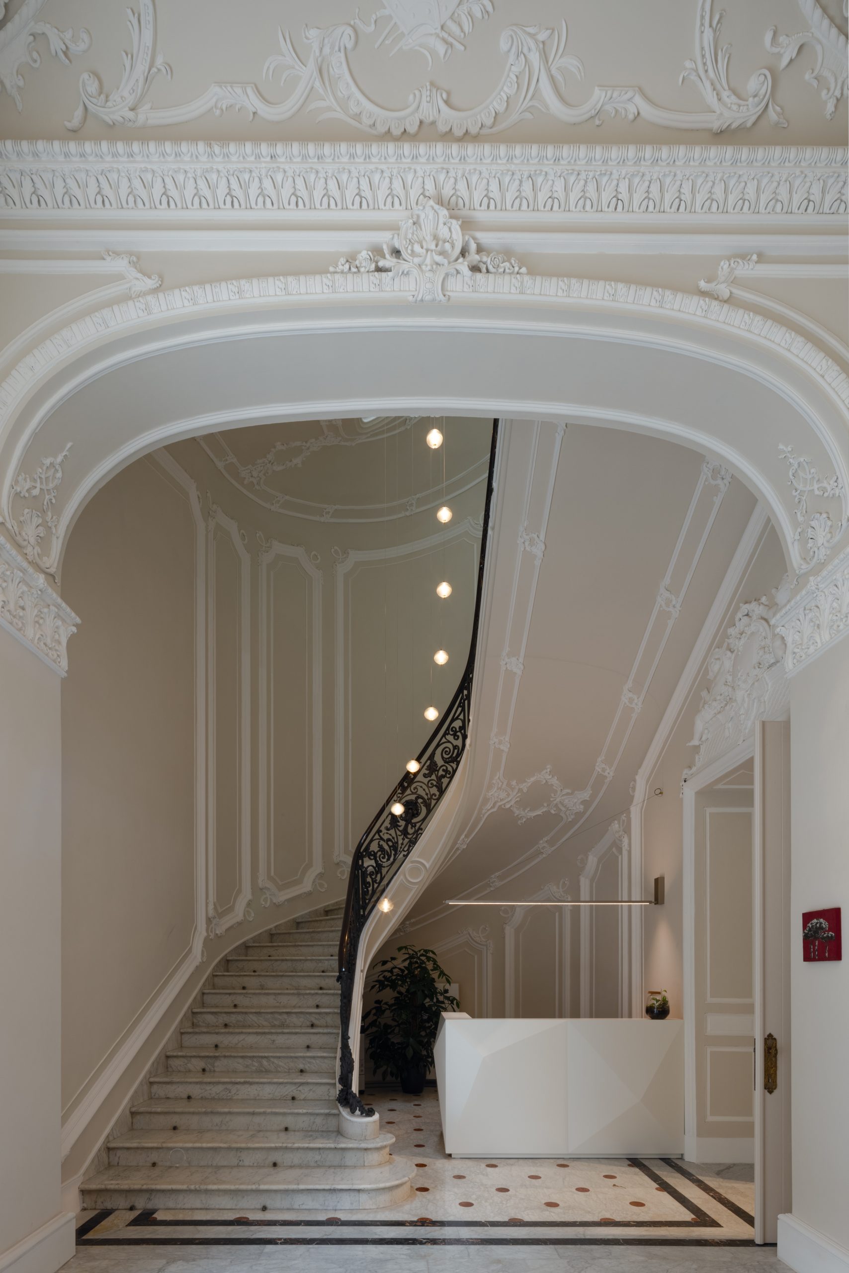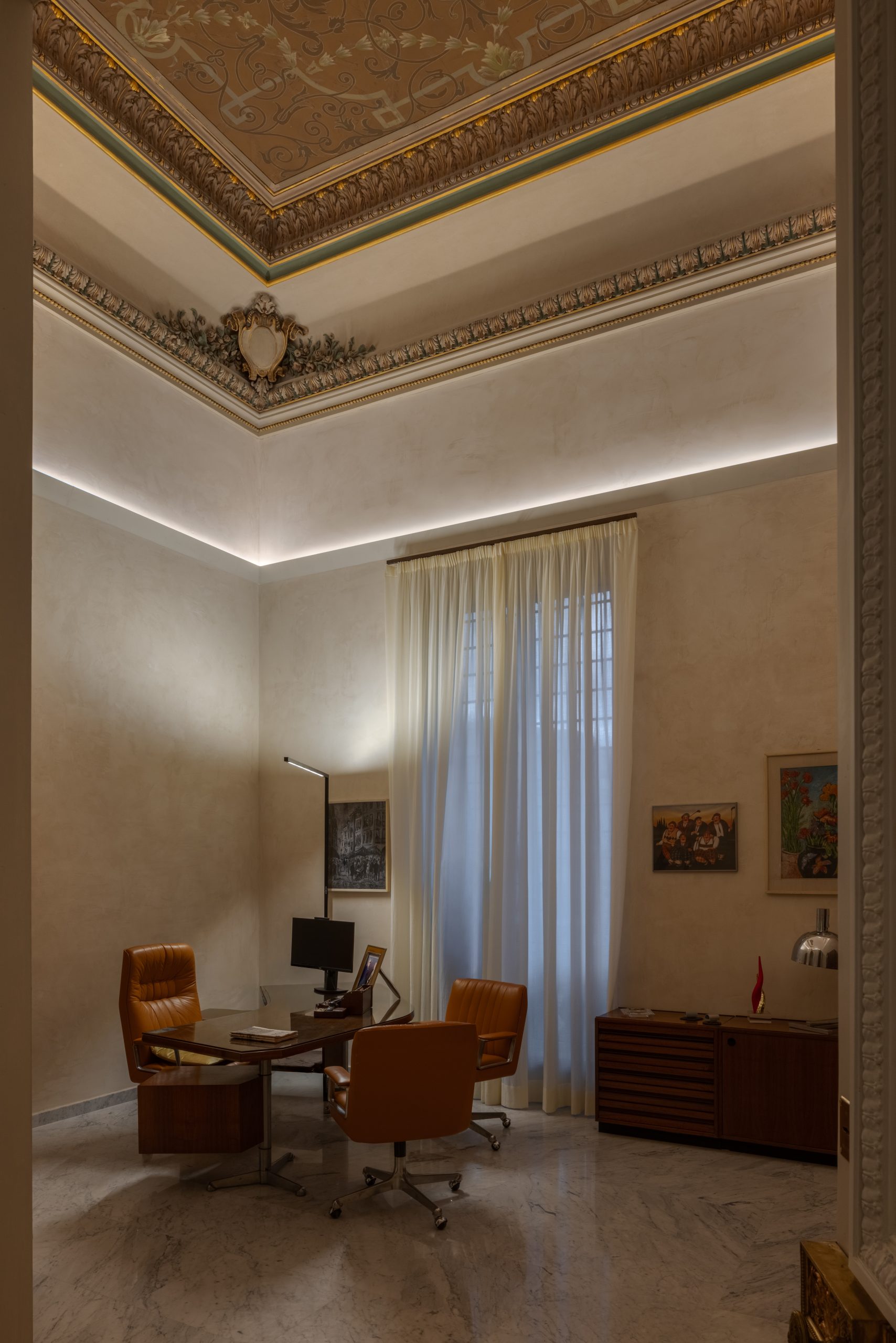 Lo spazio più complesso al piano nobile tra ambienti decorati con stucchi, affreschi e finiture di pregio, richiedeva un’attenta integrazione tra luce artificiale e architettura, senza rinunciare a comfort visivo e funzionalità negli ambienti operativi e di lavoro.