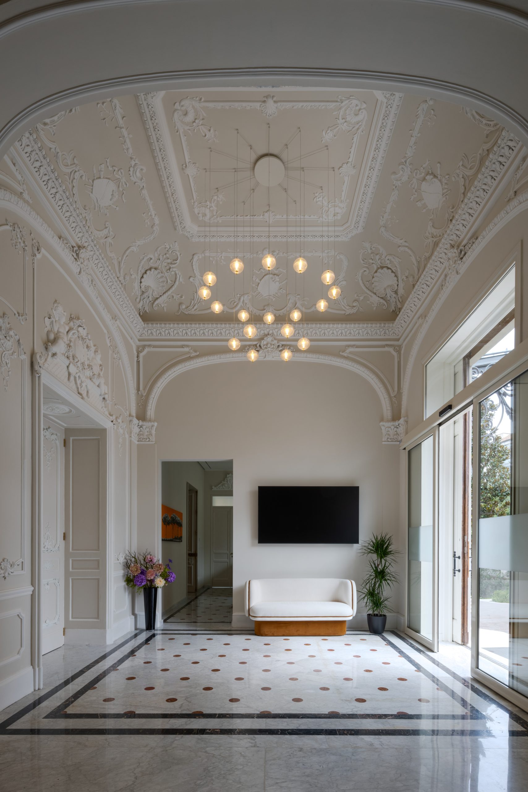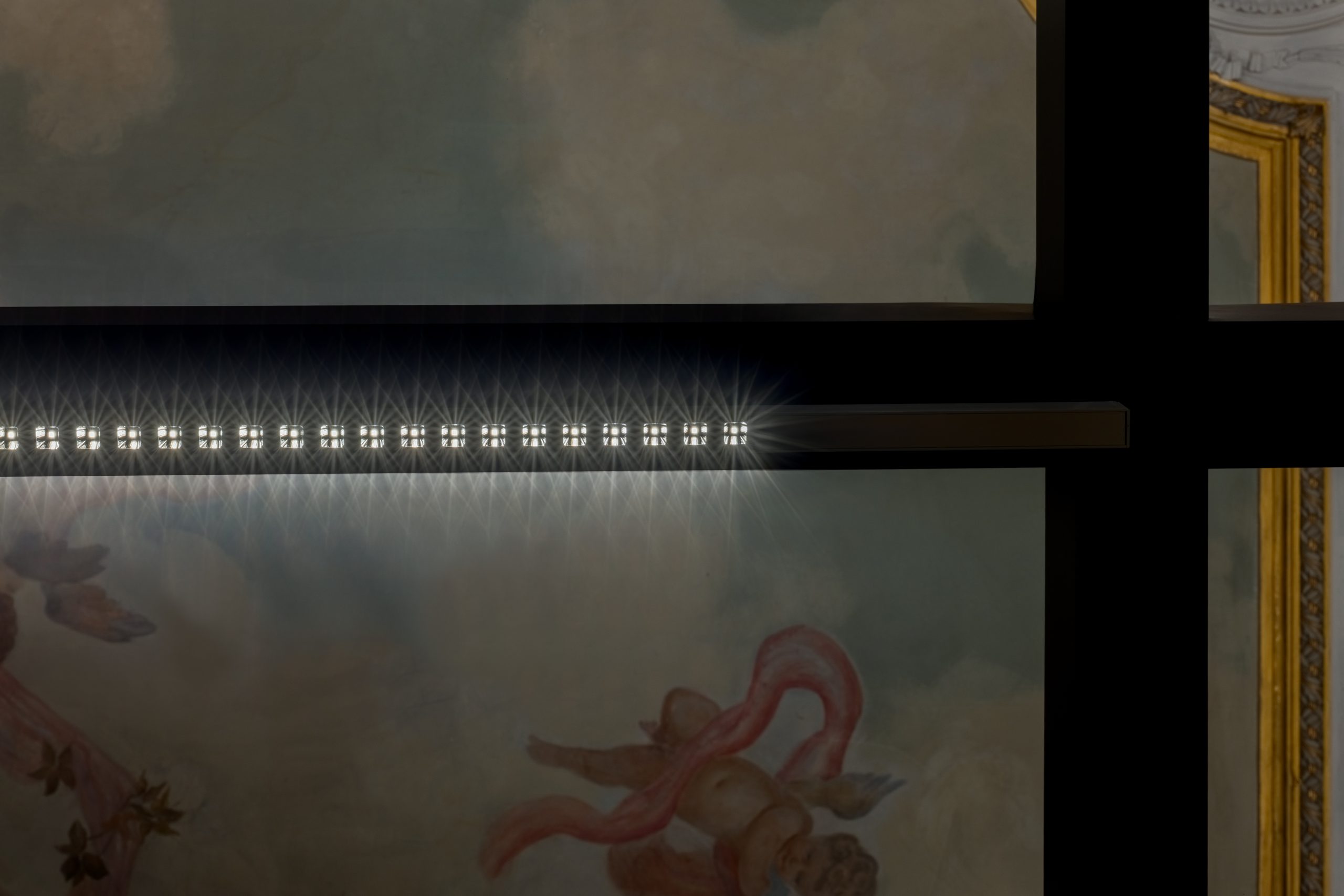 L’illuminazione del salone e della volta affrescata è realizzata con corpi illuminanti, perfettamente integrati e non visibili, che permettono di valorizzare i dettagli pittorici e gli stucchi finemente restaurati. Lo zoccolo luminoso garantisce l’illuminazione funzionale dei passaggi.