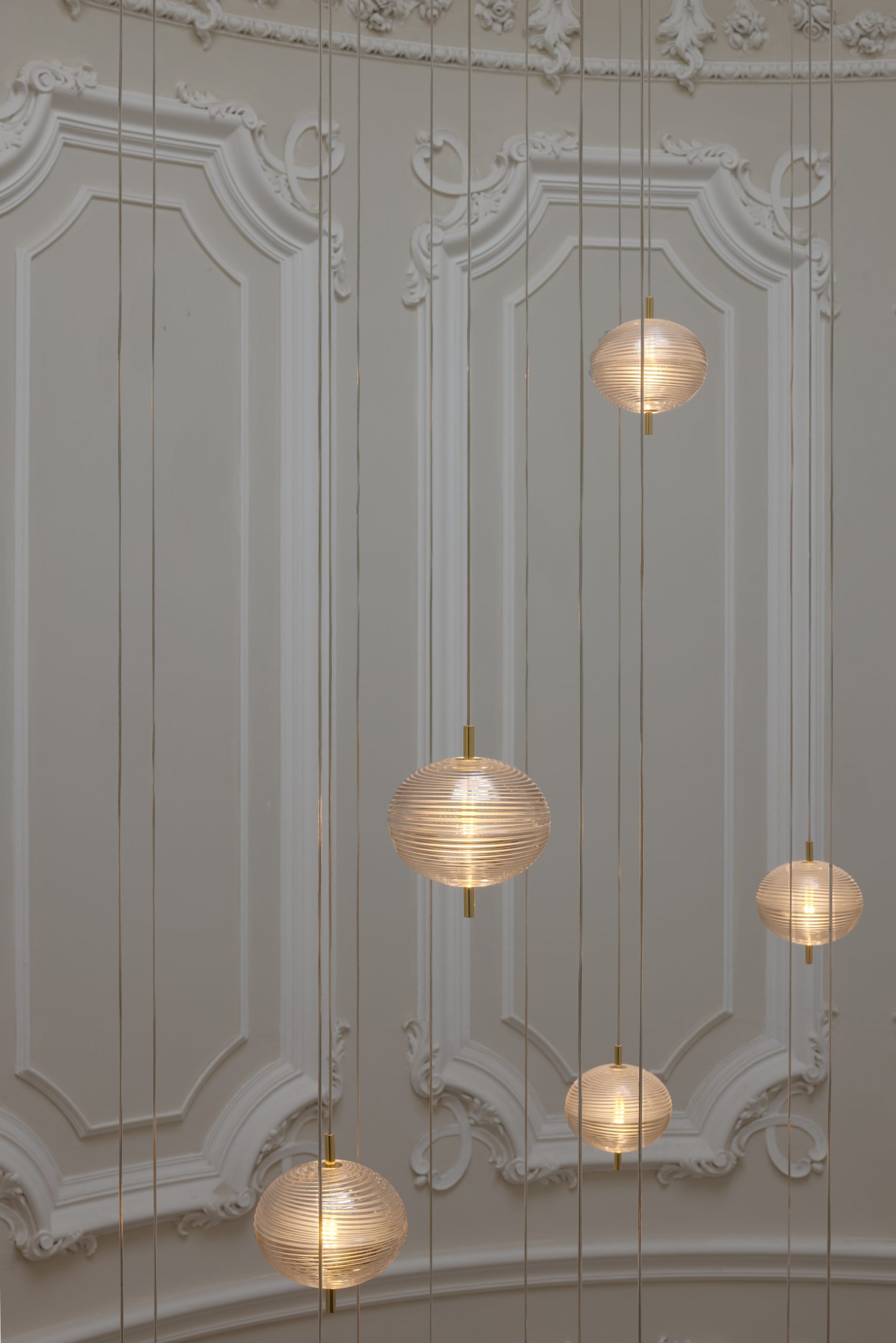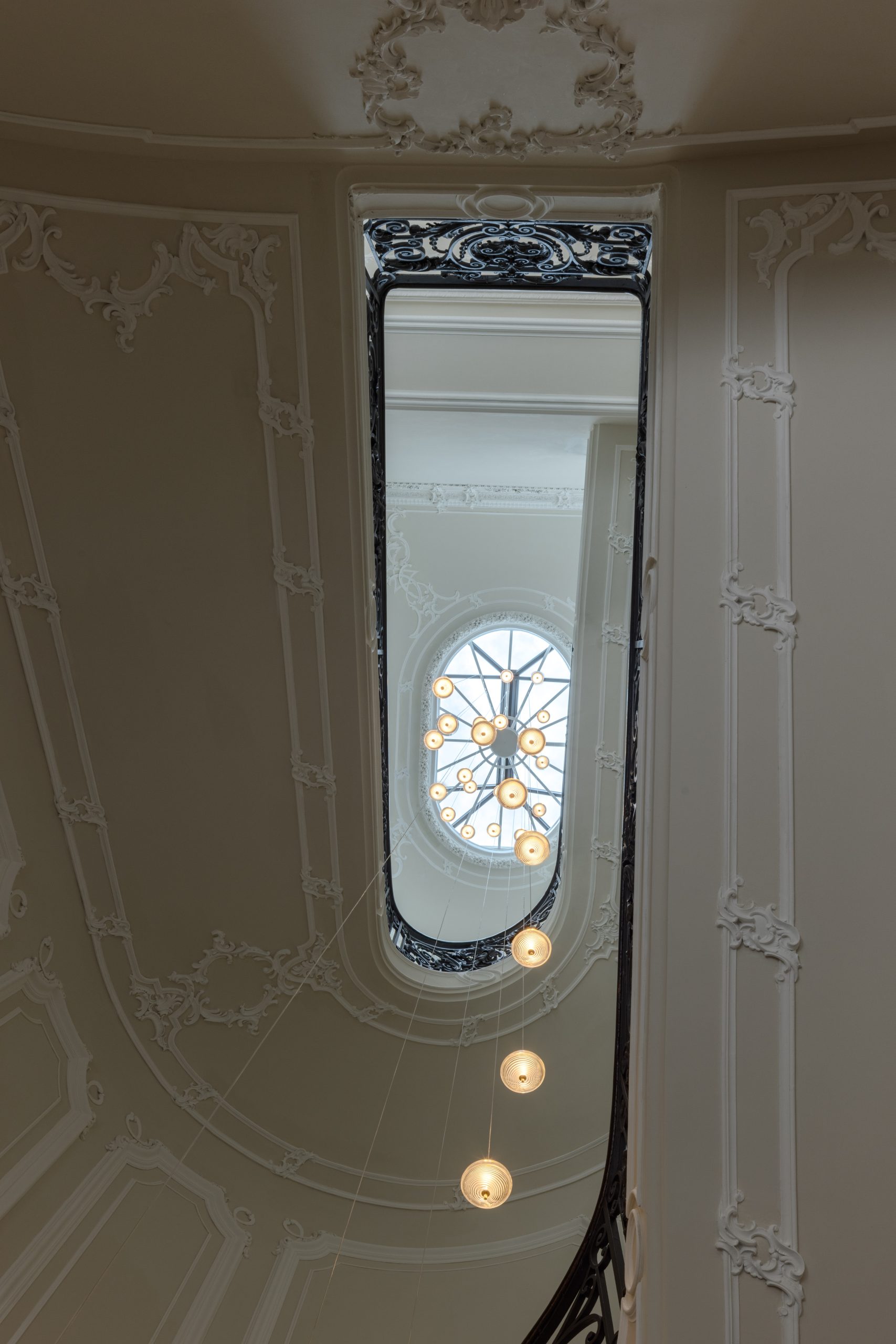 Per lo scalone monumentale abbiamo studiato insieme al fornitore una sospensione speciale lunga 18 metri e composta da 28 punti luce installati a grappolo a partire da un unico rosone.