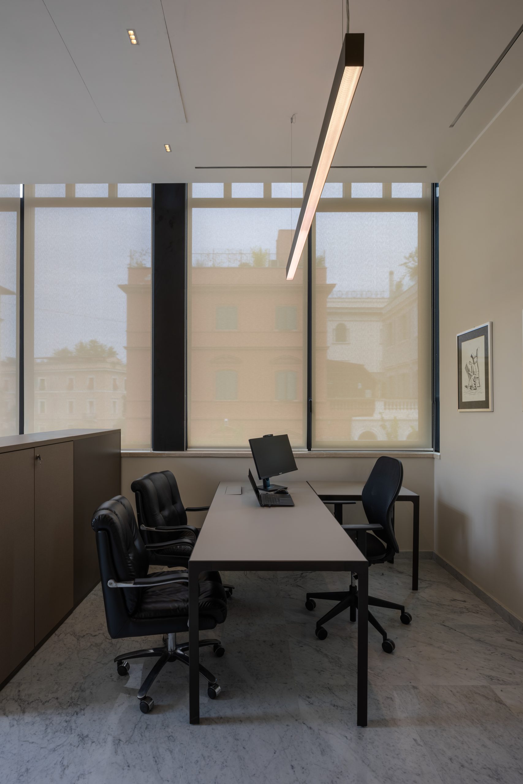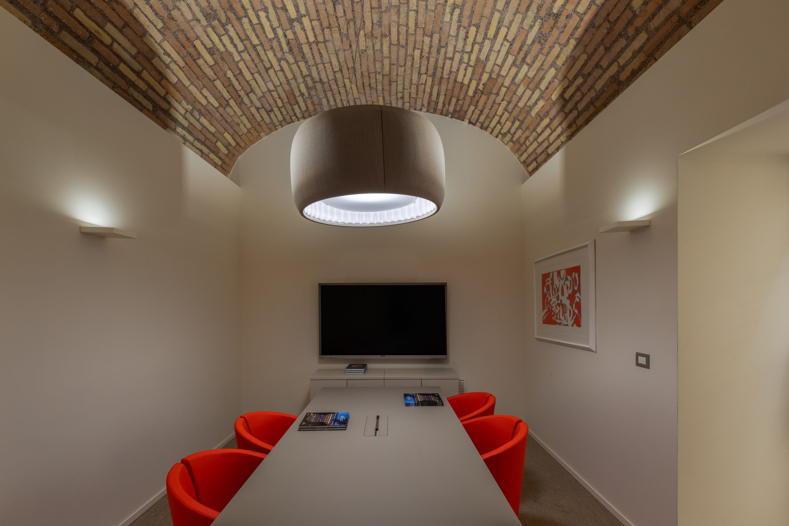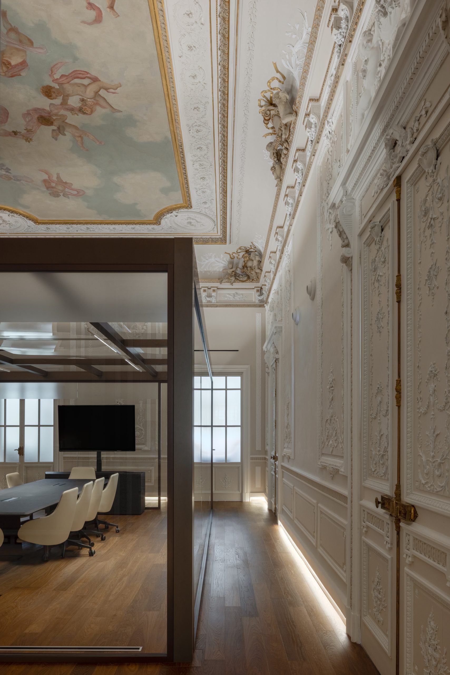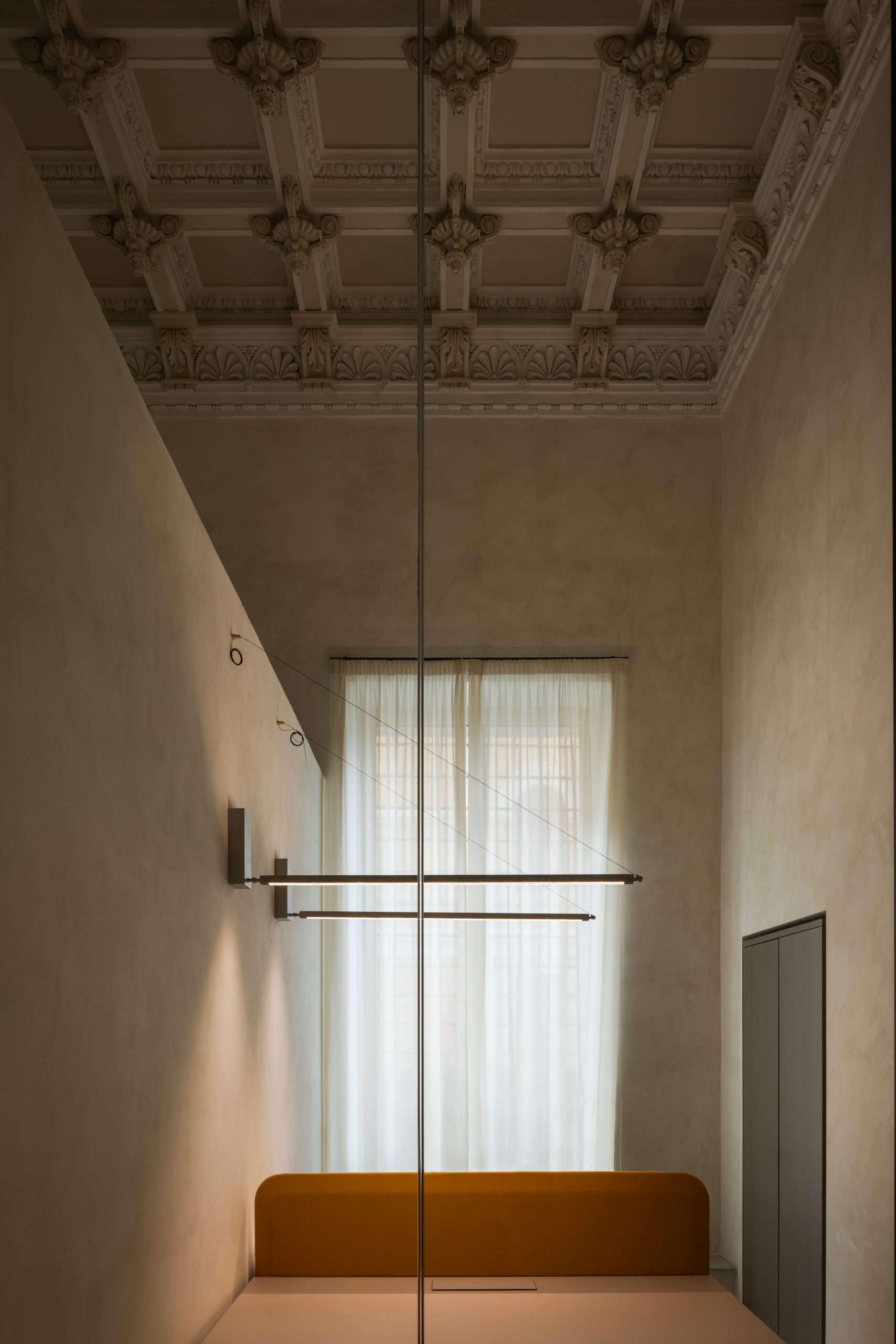 La sala riunioni interna al salone è stata progettata come una scatola di vetro per mantenere la privacy durante gli incontri e le videoconferenze, mantenendo la vista completa dell’involucro architettonico e del soffitto affrescato. In questo spazio abbiamo installato sulla struttura corpi illuminanti lineari con dimensioni minime e micro-ottiche recesse in grado di garantire la giusta luce sul tavolo riunioni eliminando completamente la percezione del corpo illuminante.
