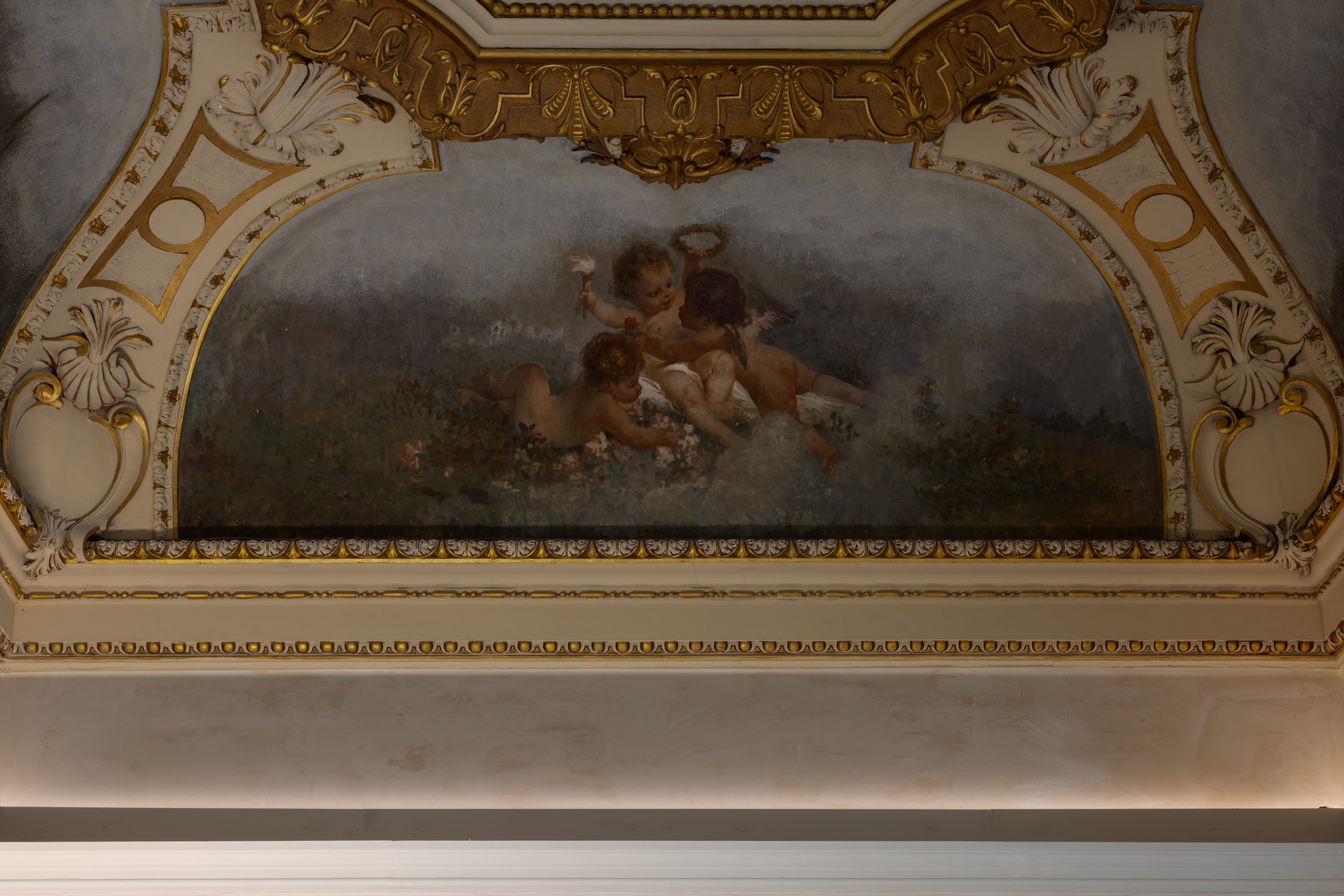 Uffici direzionali e salone di rappresentanza principale: progettazione di un’illuminazione studiata per esaltare gli affreschi storici sui soffitti.
