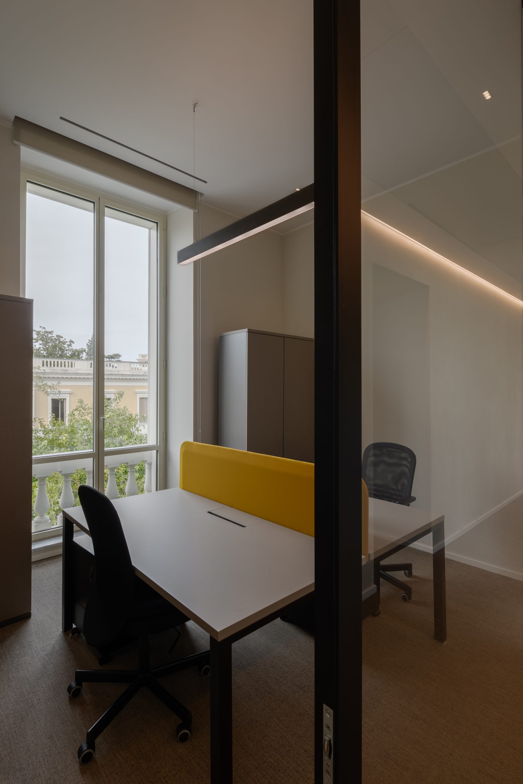 L’illuminazione degli uffici direzionali mette in evidenza le volte affrescate attraverso l’illuminazione indiretta realizzata con una cornice luminosa a parete. La luce dedicata alle postazioni di lavoro è affidata a piantane tecniche minimali con micro-ottiche recesse che abbinano perfettamente luce funzionale e comfort visivo.