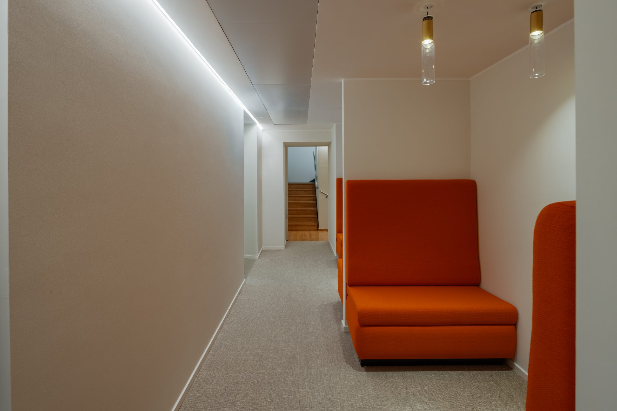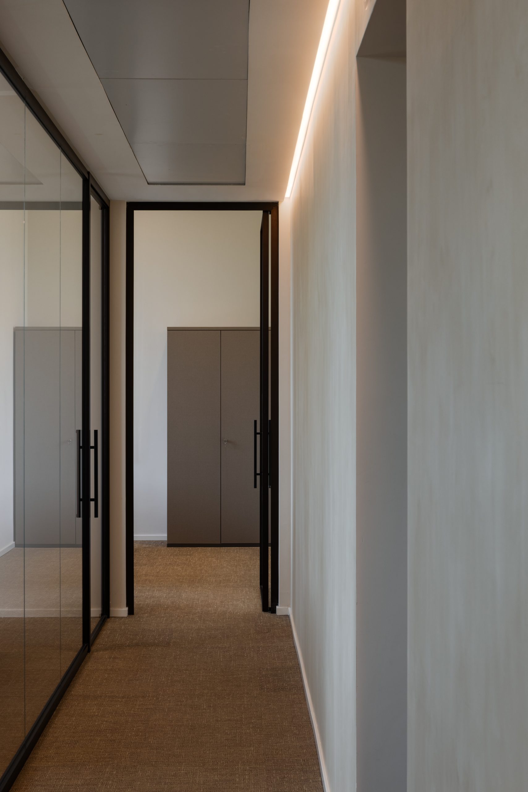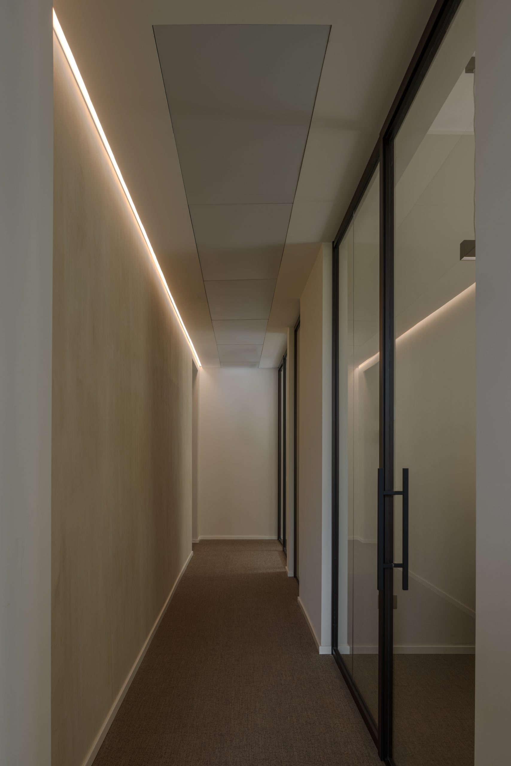 Corridoi e disimpegni: adozione di un taglio di luce tra parete e soffitto, per un’illuminazione d’accento radente della parete e una luce funzionale sul passaggio che disimpegna i diversi uffici.