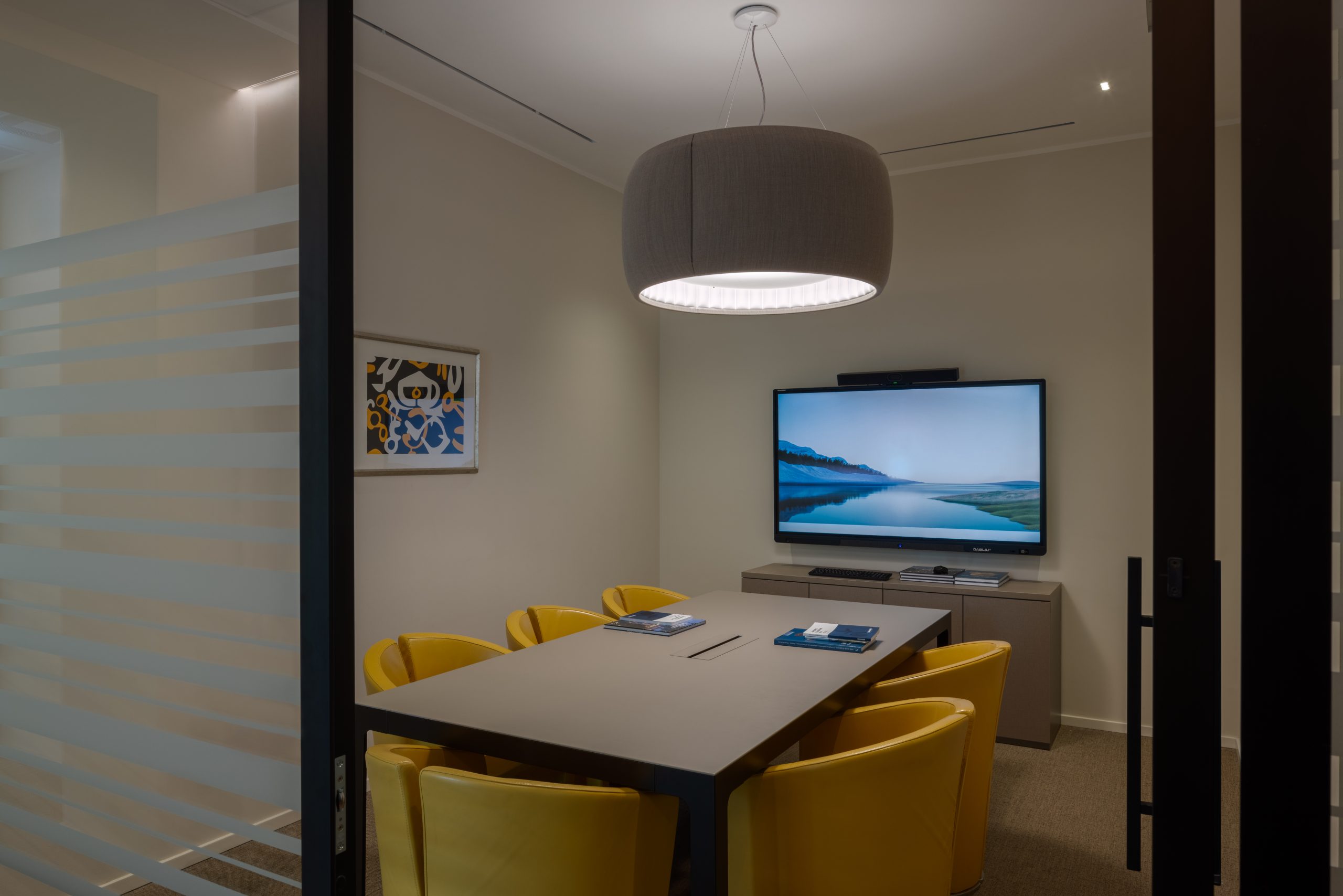 Ogni sala riunioni prevede un tastierino per il controllo dell’illuminazione che permette di selezionare la scena di luce più adatta all’utilizzo della sala, sia per riunioni che per video conferenze, conferendo massima flessibilità.