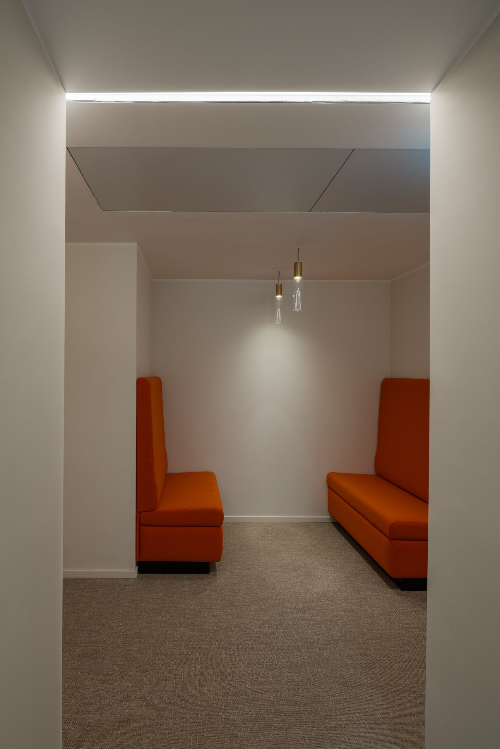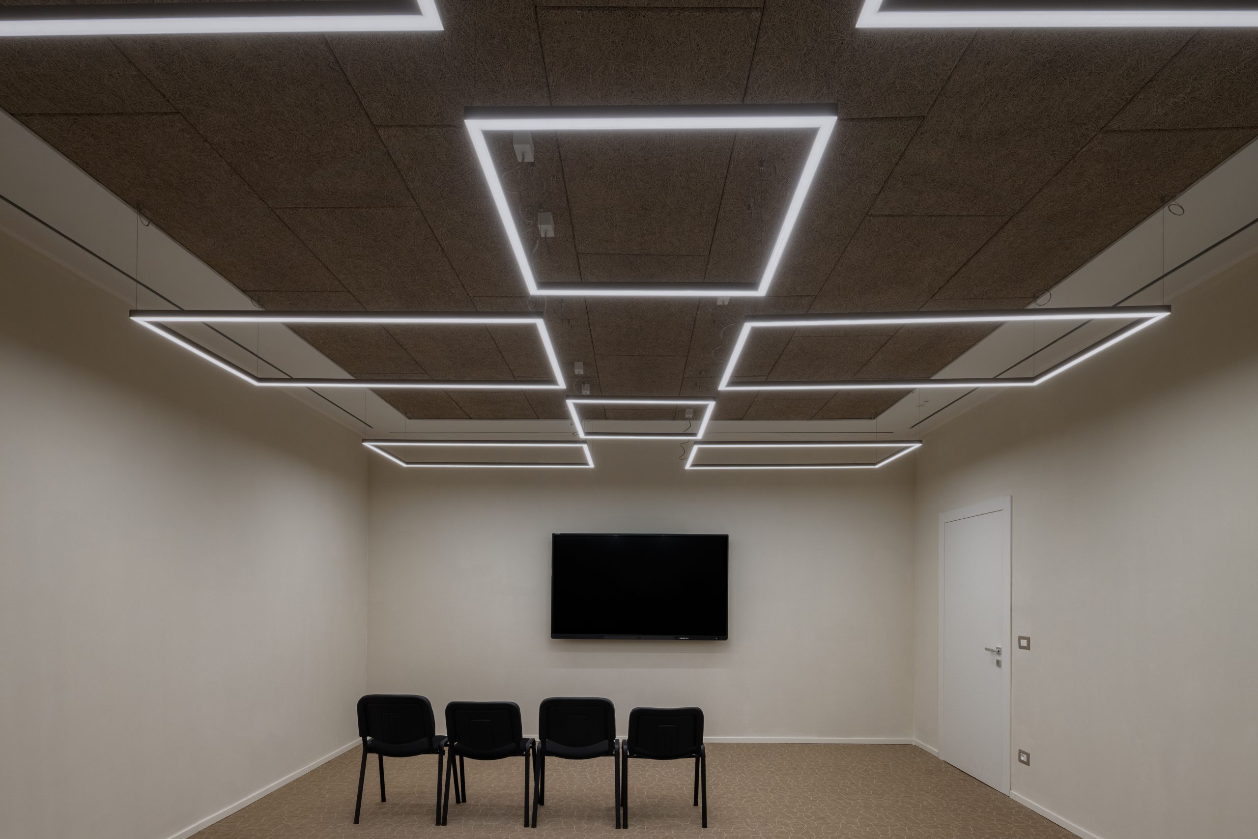 Sale riunioni ai piani operativi: utilizzo di sistemi illuminanti a sospensione con fono-assorbenza integrata, per unire prestazioni acustiche, efficienza luminosa e controllo dell’abbagliamento.
