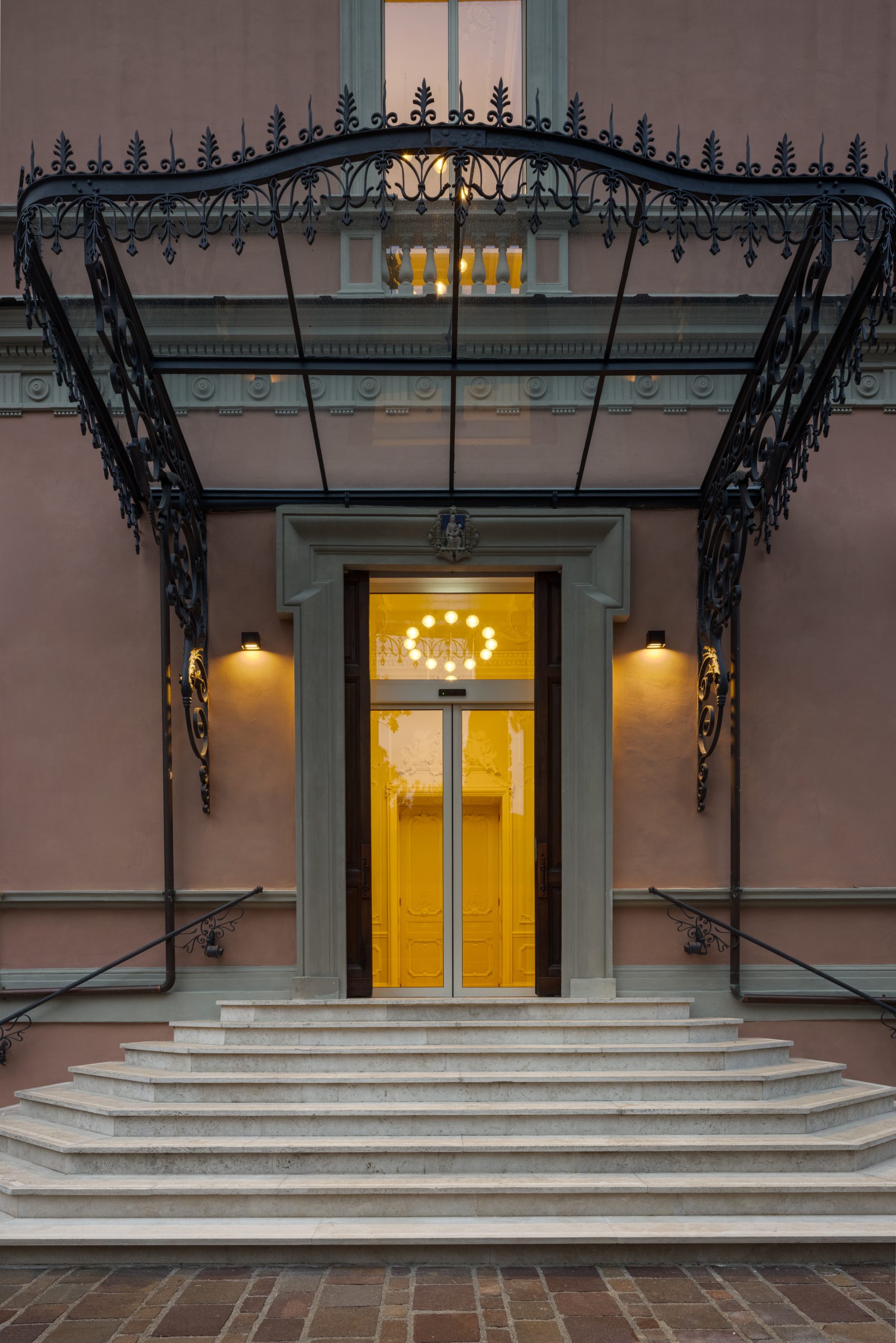 Ingresso e scalone monumentale: installazione di lampade a sospensione decorative in cristallo di Boemia dal design elegante e contemporaneo, capaci di dialogare con gli elementi storici circostanti e diventare parte integrante dello spazio.